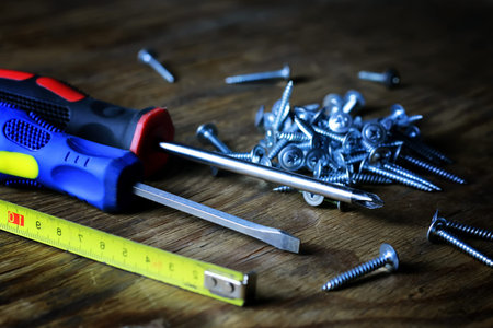 Image with sekected focus on the some screws are on the working surface for plasterboard - drywall -for gypsum walls in apartment is under construction, remodeling, renovation, extension, restoration and reconstruction.