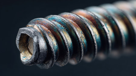 This macro photograph features a close-up view of a screw, showcasing its intricate texture and color variations, ideal for technical illustrations and artistic projects.