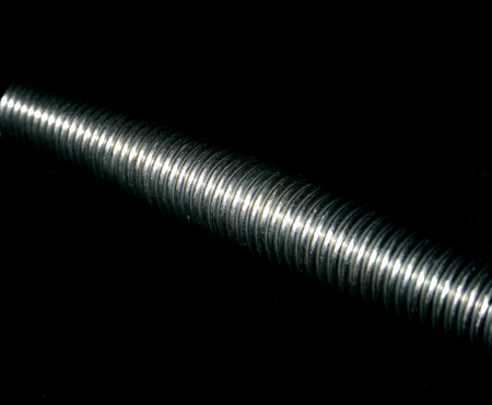 Steel screw threads photographed in macro with extreme detail and contrast, showing industrial finish
