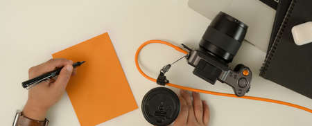 Overhead shot of male photographer taking note on notepad and holding coffee cup on white desk