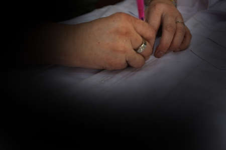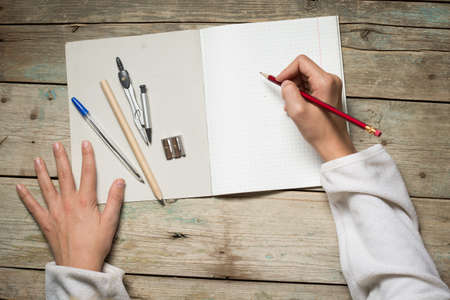 Closeup of hand young female using pencil writing on notebook and working with paperwork on desk