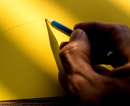 Male hand writing on a blank yellow surface with black marker. With copy space ready for your text, message or promotion.