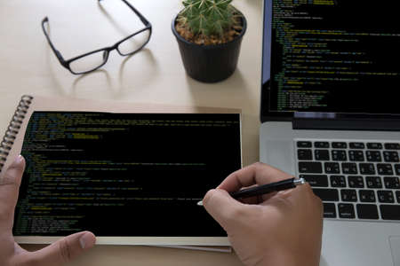 Computer code, software concept. Programmer working with a laptop, programming code on the screen, office background. Developing coding technologies.