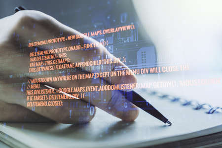 Multi exposure of abstract software development hologram and man hand writing in notebook on background, research and analytics concept