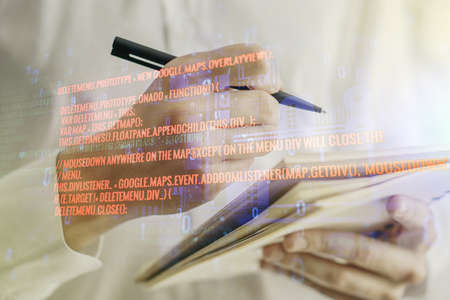 Abstract creative coding illustration with man hand writing in diary on background, software development concept. Multiexposure