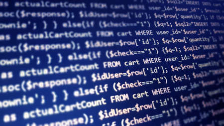 Coding programming source PHP code screen. Abstract technology background. Cyber attack or security concept. Hacker monitor program. Software development