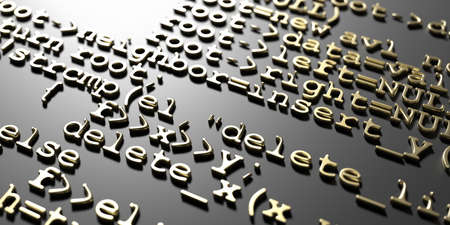 Software develop programming code. Abstract computer technology background. Digital data matrix pattern, gold algorithms embossed on black. 3d illustration