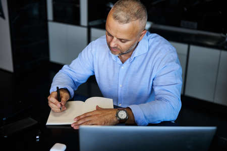High angleview of a middle-aged European man writing in a notebook, planning projects, and making notes in a diary, sitting in front on laptop at home office