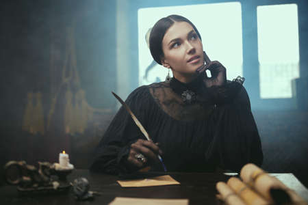 Adorable aristocratic girl in a black elegant dress with dark gathered hair sits at a table in a vintage room thinking about the contents of her letter. The heroine of the novel, 19th century style.