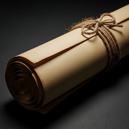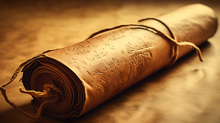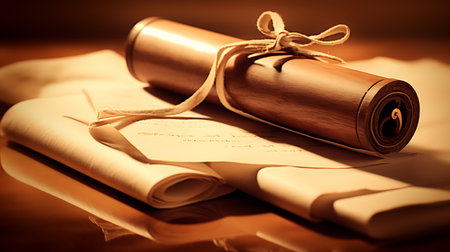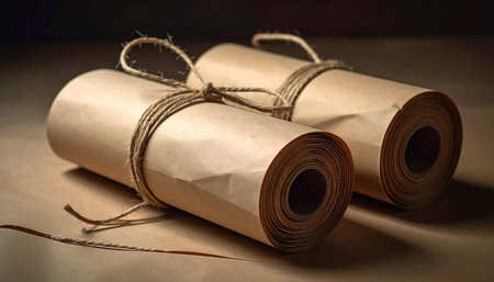 Two rolled brown paper scrolls are tied with twine on a warm brown surface. Clear details and vibrant colors ...