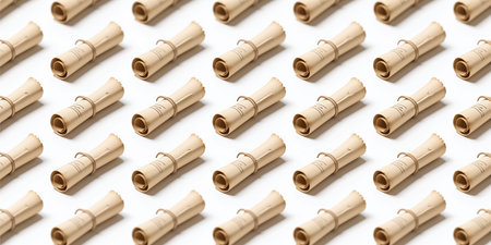 A vintage, repeating pattern of rolled, parchment-like papers, tied with twine and featuring subtle handwritten markings, displayed on a white background.