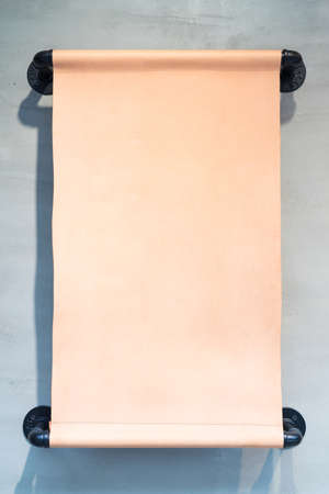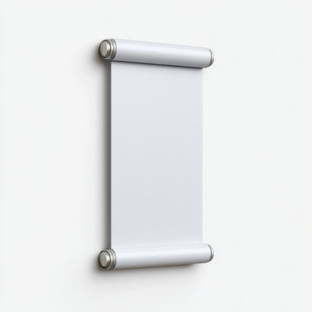 A blank scroll paper attached to a white wall with metal holders, offering a clean and elegant presentation for creative designs, messages, and announcements.