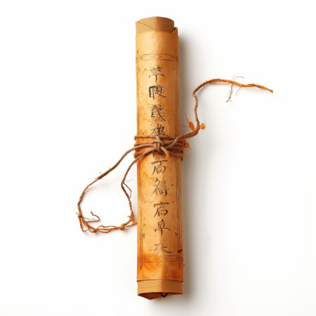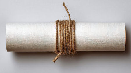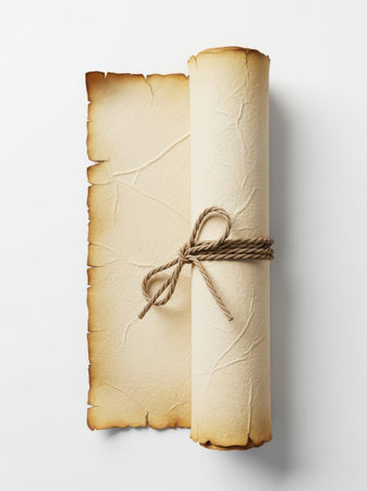 A vintage scroll document with aged, yellowed parchment tied with a rustic string against a clean, white background, evoking a sense of history and tradition.