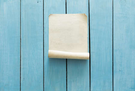 old paper on blue wooden wall, retro background