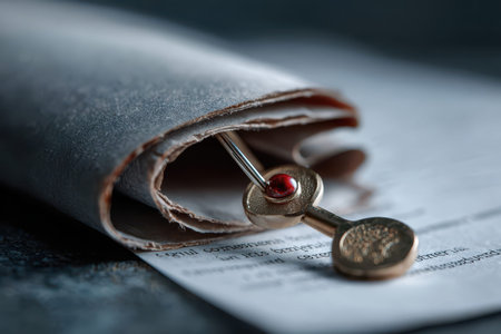 Two aged parchment documents gently secured with a vivid red ribbon, evoking a sense of significance, tradition, or treasured legacy on a subtle backdrop.