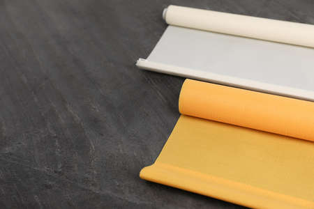 Stylish roller window blinds on black table, space for text
