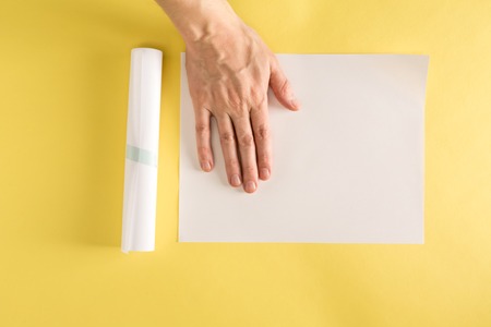 Persons hand and an empty sheet of paper on a yellow background