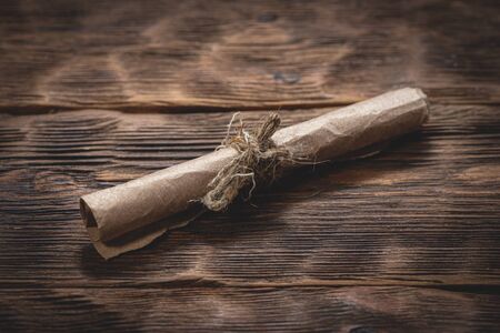 Close-up old scroll on wooden desk. Rolled paper on grey wooden table.