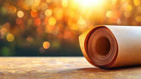 A beautifully rolled piece of brown craft paper on a textured surface, featuring a soft blurred background with warm yellow and orange tones, perfect for creative projects and artistic inspiration.