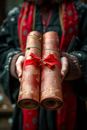 A person holds two intricately decorated scrolls tied with red ribbons, evoking a sense of ancient knowledge and tradition.