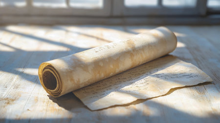 Ancient Scroll of the Book of Esther in Sunlit Room. Concept of Jewish Heritage, Cultural Tradition, Historical Manuscripts. Purim.