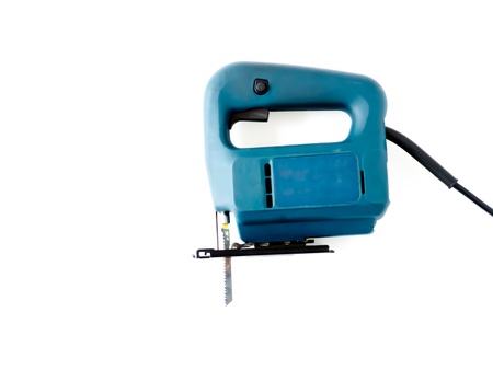 Jigsaw for cutting wood. Tools in a home workshop. Light background.