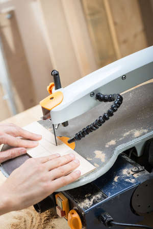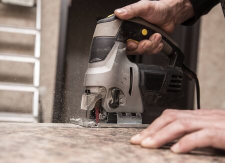 Closeup hand of woodworker with professional cutting tool fretsaw or jigsaw, cut wooden tabletop, sawing plank, brown filings, sawdust. Concept cut a hole for the sink in the kitchen