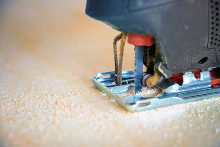Close-up detail of an electric jigsaw sawing up a plywood board