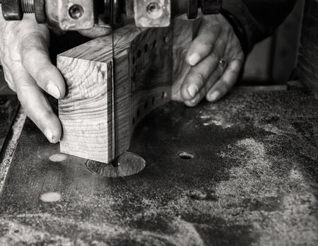 Cutting parts made of wood on the bandsaw. Wood processing workshop.