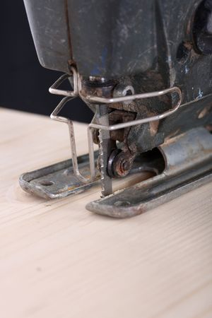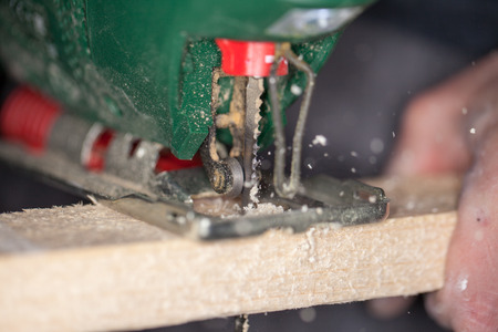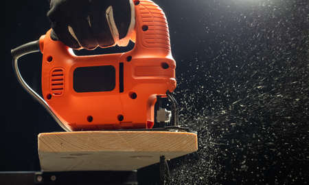 Close up electric jigsaw cutting a piece of wood, electric hand tools