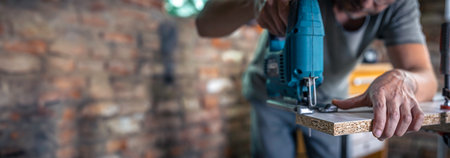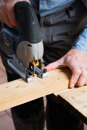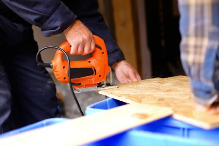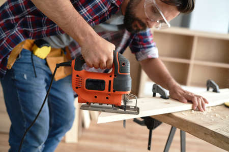 Close up carpenter cutting wood with jigsaw in workshop on construction site. Concept of home improvement and overhaul.
