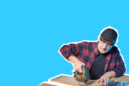 Carpenter on blue background. Carpenter works with electric jigsaw. Electric jigsaw in hands of man furniture maker. Man is engaged in woodworking. Place for inscription about work as furniture maker