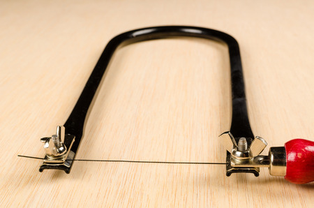 Close up electric jigsaw and hand saw blades above wooden bricks