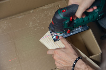 man using electric jigsaw at home to cut piece of wood board on a cardboard box. Do it yourself.