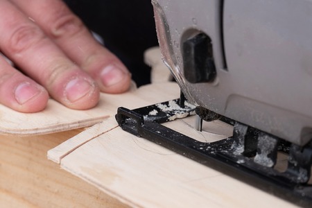 Close up on hand of unknown carpenter working with an electric jigsaw cutting wood with saw woodworking hobby concept
