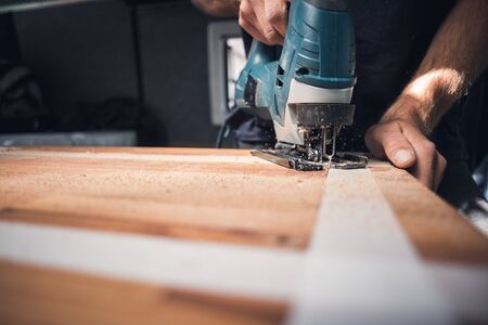 Close up of professional carpenter hands sawing wood with an electric jigsaw in the carpentry workshop
