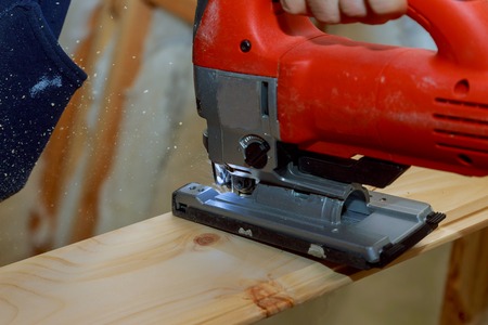 Close up of carpenters hands working power tools for processing wood. Power Jigsaw
