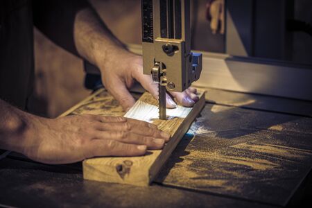 detail of a carpenter's hands using a band saw to cut a wooden plank