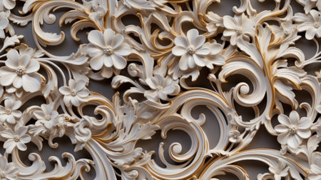 a stucco floral pattern on a wall within an elegantly decorated room. The image highlights the pattern's role in enhancing interior aesthetics. SEAMLESS PATTERN. SEAMLESS WALLPAPER