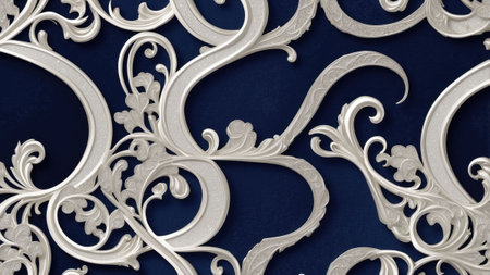 Intricate silver scrollwork and seashell motifs are arranged in a repeating pattern against a dark, textured background creating a luxurious and ornate design.
