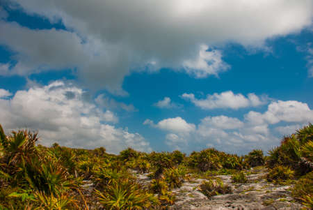 Beautiful Mexican landscape with trees and bushes on a blue sky background with white clouds. Tulum, Riviera Maya, Yucatan.