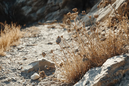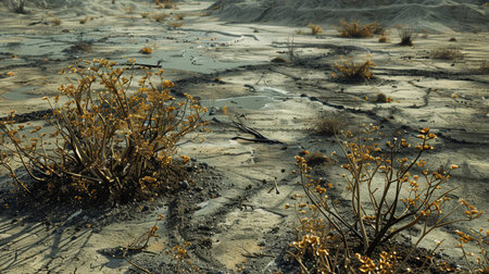 Photo of a dry desert landscape with dead plants and rocks, showing the impact on vegetation due to climate change in the style of Gamefish, taken with a Canon EOS R3. --ar 3:2 --v 6.1 Job ID: 29262653-00d9-476b-9b30-1c043ad77428