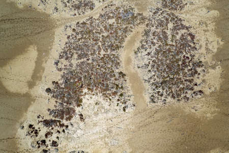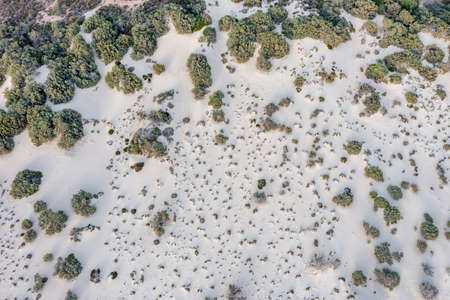 Elafonisos sandy coast and vegetation aerial view. Wild plants and white sand dunes, endemic flora from above