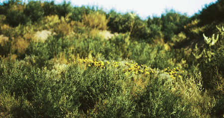 A vibrant hillside is filled with diverse greenery and colorful wildflowers, basking in sunlight on a pleasant day. Nature thrives in this peaceful outdoor setting.