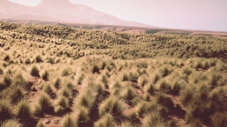 savannah, green plants in the Mongolian desert against the backdrop of mountains