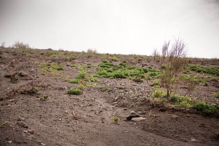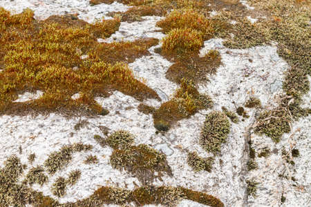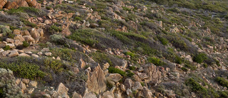 Stony soil, covered with moss and shrubs. Subtropical plants of Cyprus. Mediterranean Sea coast.