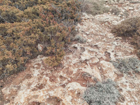 Green plants and dry foliage on rocks of Cape Greco National Park, Cyprus