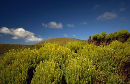 Closeup of lush yellow-green bushes and moss. Background of blue sky with clouds, green hills and fields