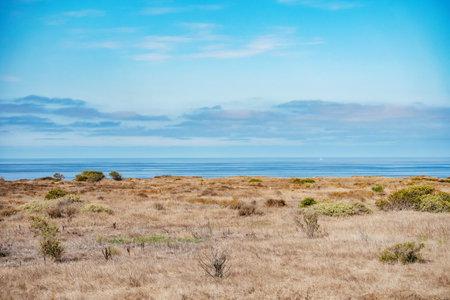 Yellow grass, blue Pacific ocean with waves and purple clouds landscape traveling from Los Angeles to San Diego California