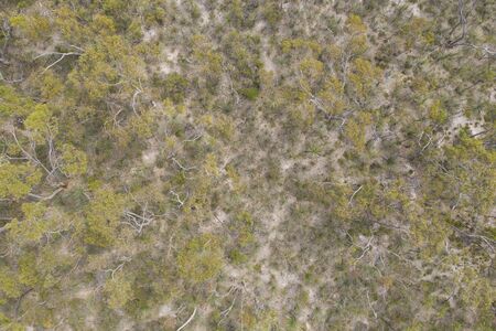 Landscape photographed from above in which the top of several green and yellow trees and the soil on the ground can be seen.